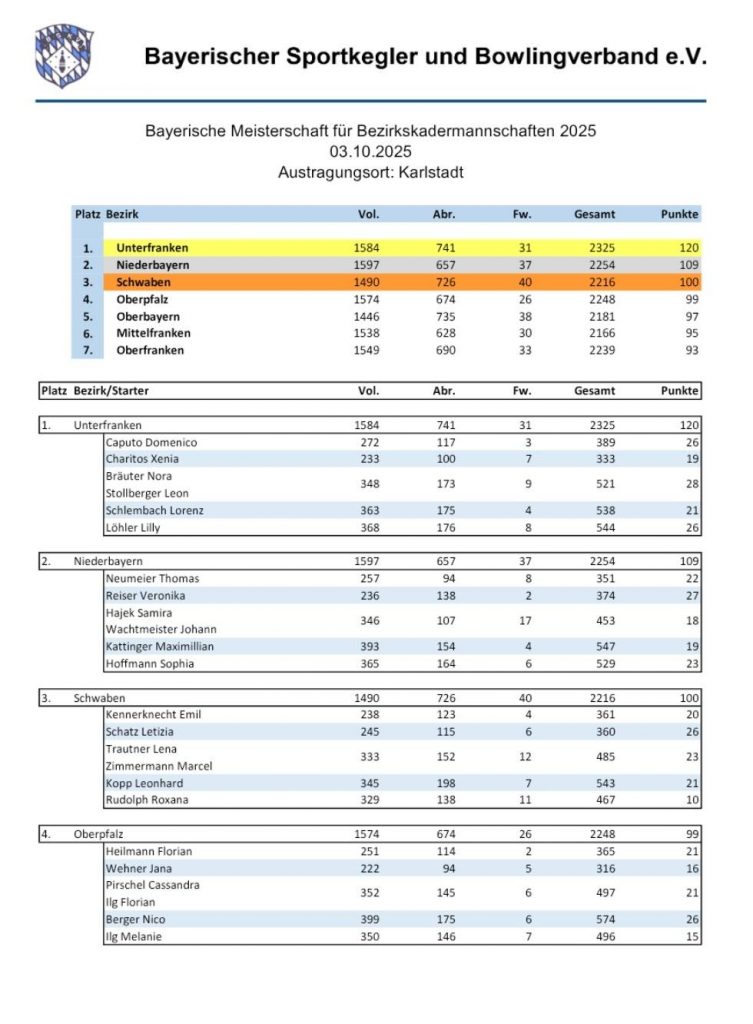 Am 3.10 fand die Bayerische Meisterschaft für Bezirkskadermannschaften in Karlstadt statt. Hierzu wurden von mir dem Bezirkslehrwart Martin Gahr, folgende Spieler und Spielerinnen nominiert. Für den Sprint weiblich, Veronika Reiser vom TSV Altfraunhofen, für den Sprint männlich, Thomas Neumeier vom Djk Adlkofen. Im Tandem Mixt, startete Johann Wachtmeister vom KV Deggendorf und Samira Hajek vom KV Passau. Im Einzel männlich spielte Max Kattinger von Aufwärts Straubing und im Einzel weiblich spielte Sophia Hoffmann vom Skc Landau.
